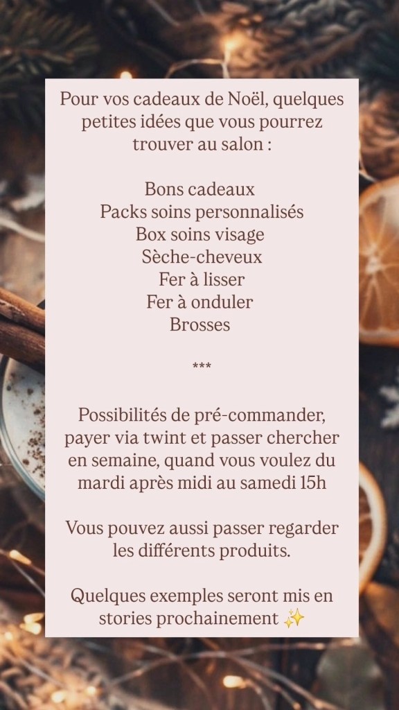 🎄🎉 Pour les fêtes choisissez les cosmétiques, fers, accessoires à choix au salon et faites votre pack à offrir !