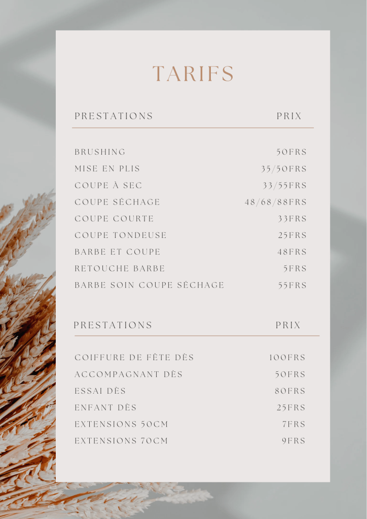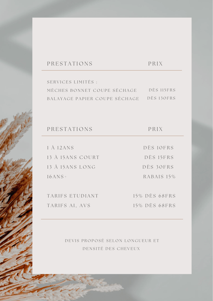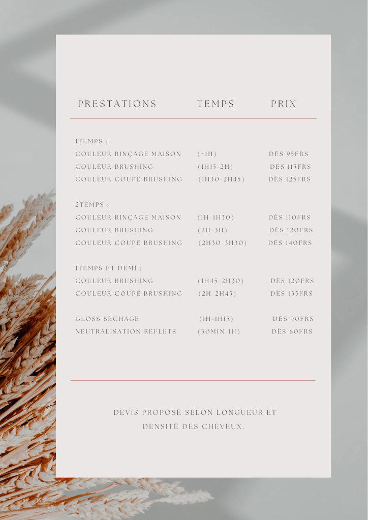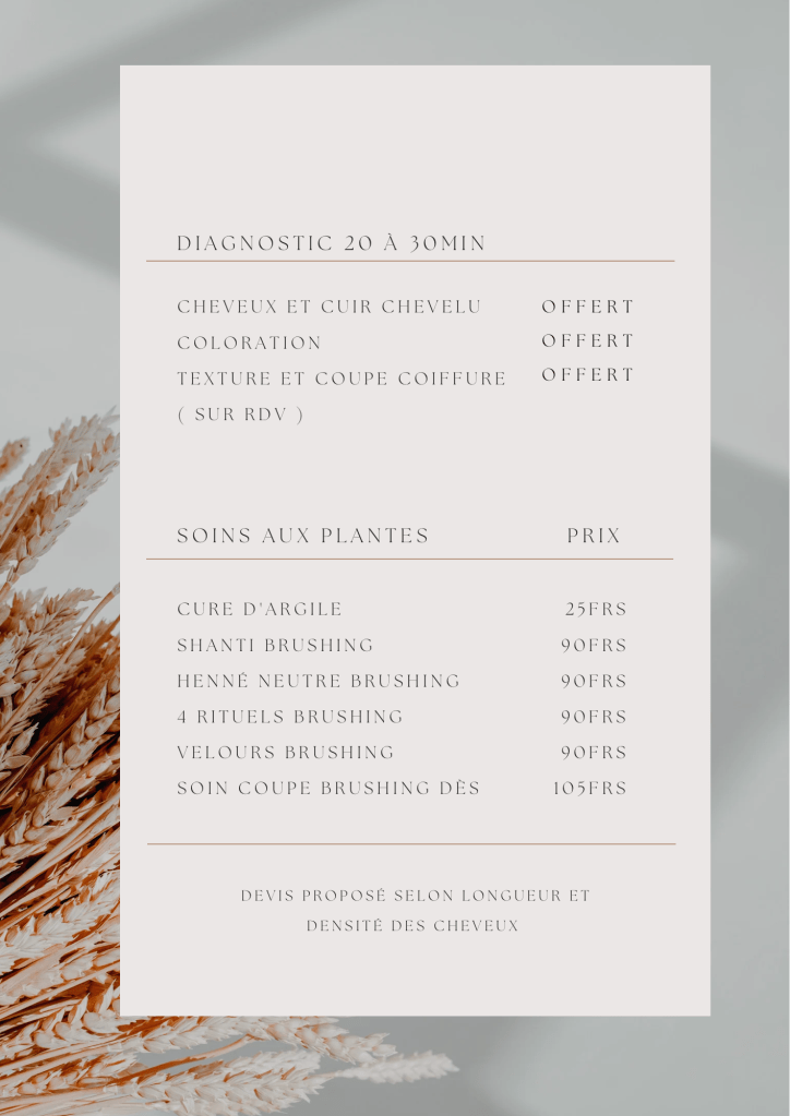 Les tarifs pour la coloration végétale sont calculés en fonction de la quantité de poudre utilisée ainsi que le temps du service. Les shampooings, baumes et produits de finish, sont compris dans les prix inscrits ci-dessus.